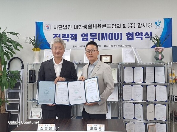 사단법인 대한생활체육골프협회(회장 배철훈)는 지난 6월 4일(화) 오후 2시, ㈜맘사랑 본사 사무실에서 ㈜맘사랑(회장 신승용)과 골프회원 복지 확대 및 공동 발전을 위한 전략적 업무협약(MOU)을 체결했다.